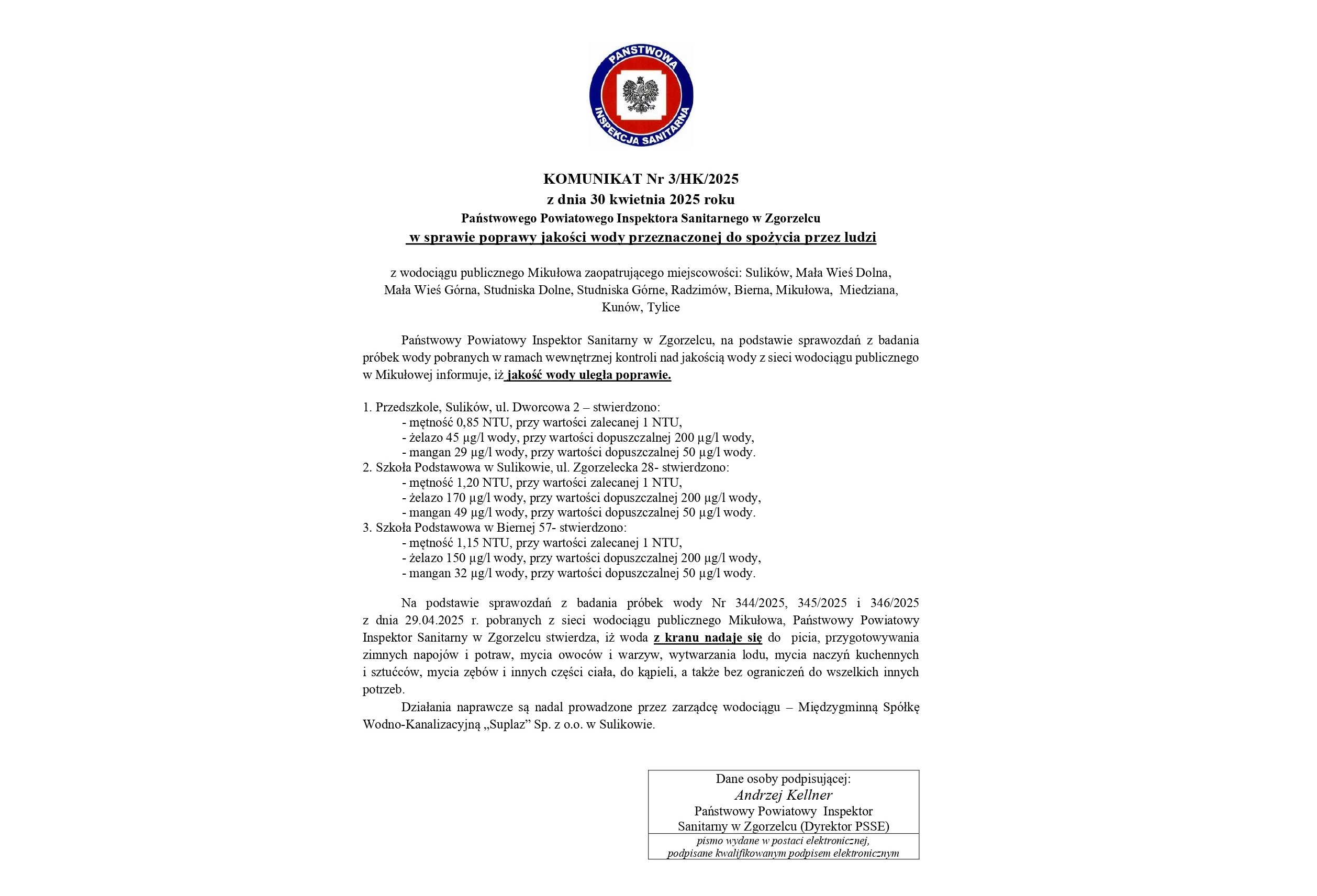 KOMUNIKAT NR 3/HK/2025 PPIS W ZGORZELCU - 30.04.2025 R.